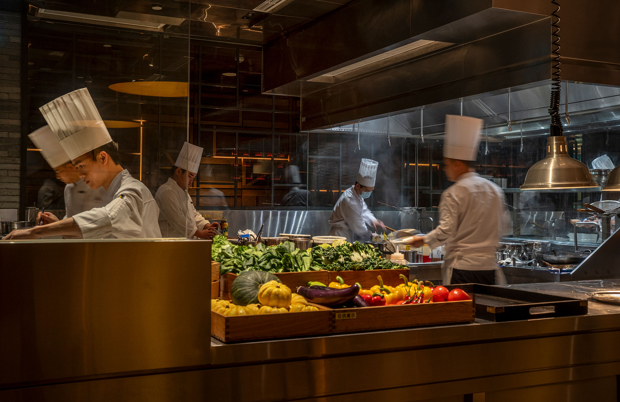 The Open Kitchen creates a dynamic interactive centre piece within the Restaurant that’s visually enjoyed by guests who can marvel or witness the amazing chefs’ art of cuisine.